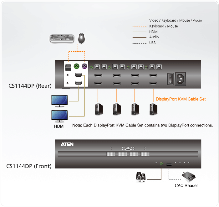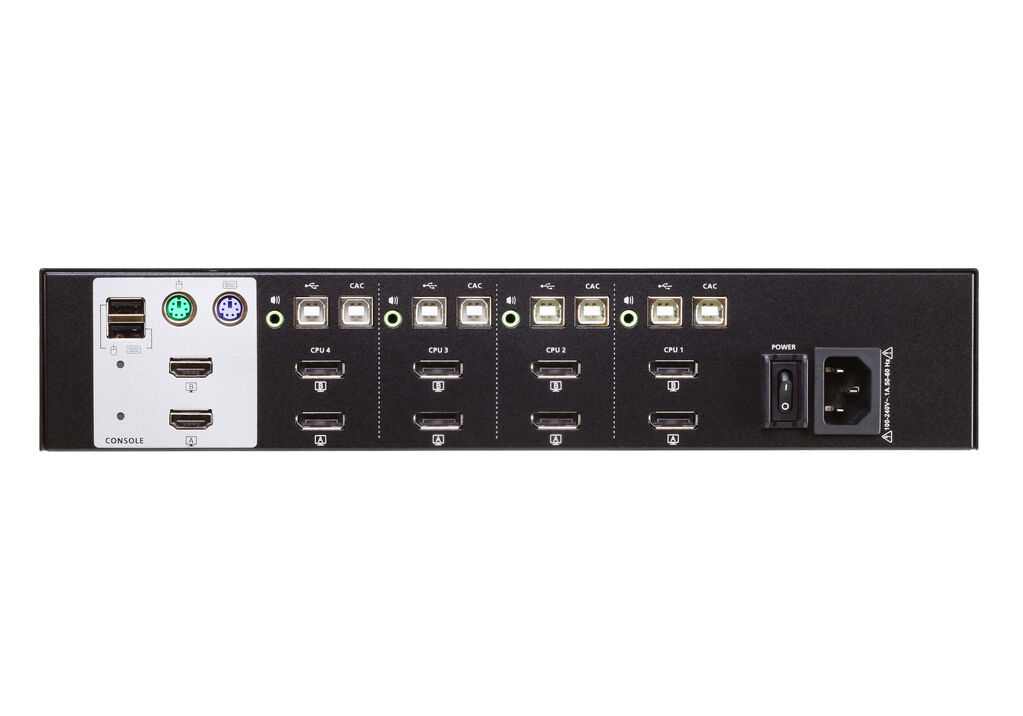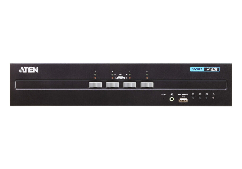 ATEN PSS PP v3.0 Secure KVM Switch (CS1144DP) provides isolation between computer sources and peripherals while sharing a single keyboard, mouse, monitor, speaker set, and Common Access Card (CAC) reader between connected computers of various security classifications. Compliance with PSS PP v3.0 ensures peripheral sharing capabilities provide maximum user data security when switching port focus, preventing unauthorized data flows or leakage between connected sources. Key protections include isolation and unidirectional data flow, restricted peripheral connectivity and filtering, user data protection, configurable device filtering and management, and always-on tamper-proof design, keeping sensitive assets isolated and providing advanced security and a user friendly design for instantly secure deployment.
