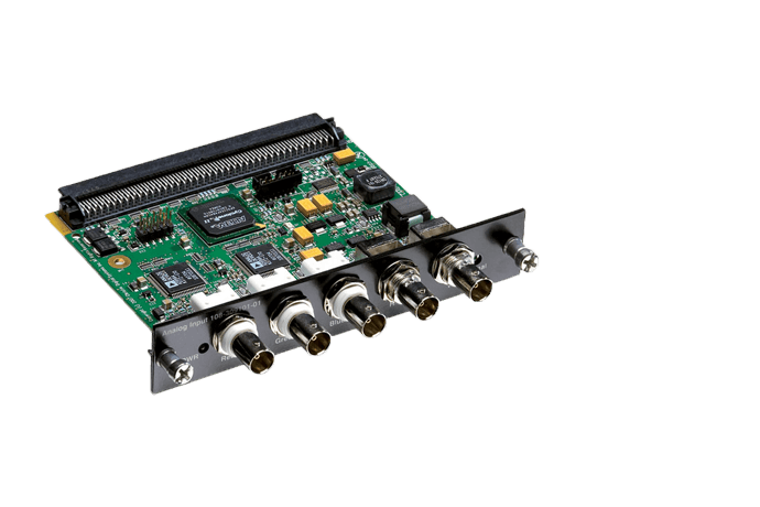 The Analog input card accepts an analog video signal input over a 5 BNC connector interface. It can accept RGBH&V signals over 5 connectors, as well as component YPbPr signals on the RGB inputs.