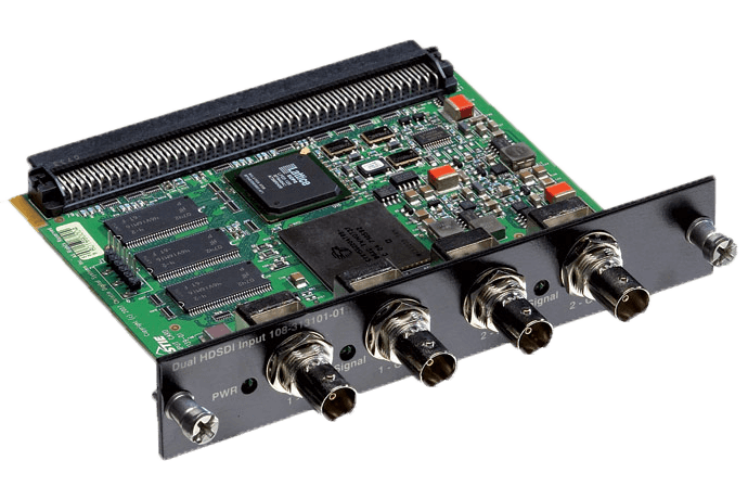 The Dual SD/HD-SDI input card accepts both standard definition (SD) and high definition (HD) serial-digital interface (SDI) signals, and enables the user to connect two of either types of signal. Both single-link HD and dual-link HD signals are accepted. This card also has two SD/HD-SDI outputs to enable “loop through” for its respective input.