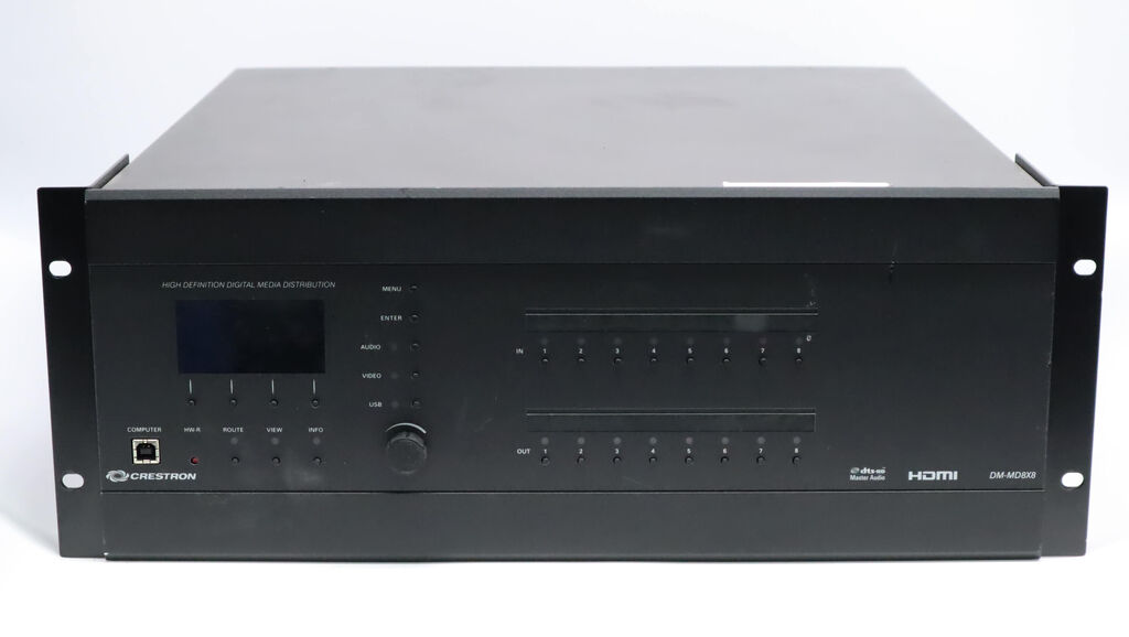A fully modular and expandable 8x8 DigitalMedia matrix switcher offering ultra-fast digital video and audio switching, and lossless HD multiroom signal distribution, for all types of AV sources. Provides complete management for SD, HD, UHD, 2K, 4K, and computer signals with advanced HDCP support, EDID resolution management, CEC signal management, USB signal routing, integrated Ethernet switch, simultaneous 7.1 and stereo audio, H.264 streaming, and a full range of selectable input and output types.
