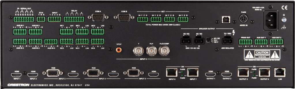 | DM INPUT 6 – 7 | (2) 8-pin RJ45 female, shielded; DM 8G+ inputs, HDBaseT compliant; PoDM and PoH PSE (Power Sourcing Equipment) ports [6]; Each connects to the DM 8G+ output of a DM transmitter or other DM device, or to an HDBaseT device, via CAT5e or Crestron DM-CBL-8G cable [5] |