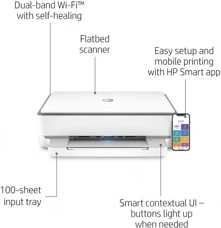 For everyone in the family. For every device. Print, scan, and copy everyday documents, schoolwork, photos, and more. Set up and connect on any device with HP Smart app, and get self-healing Wi-Fi™