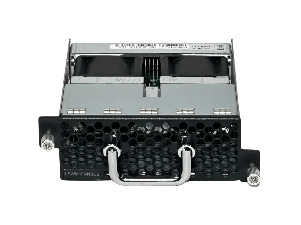 The LSWM1FANSCB (JC683A) fan tray draws in hot air from the front (port side) to the back (power side). It comprises two separate fans. The LSWM1FANSCB features small size, fast heat dissipation, and hot swapping. It can automatically adjust the fan speed, providing powerful heat dissipation for the device.