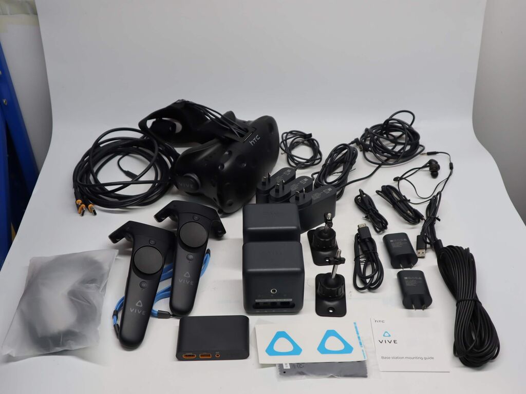 The HTC Vive Virtual Reality Headset features a head-mounted display, two controllers and two base stations. The headset features a 110 field of view, a refresh rate of 90Hz and a built-in microphone. Other features include a front-facing camera, built-in headphones and a laser position sensor. The headset supports connectivity via Bluetooth and wired connections via USB 2.0, HDMI, and a 3.5mm audio jack.