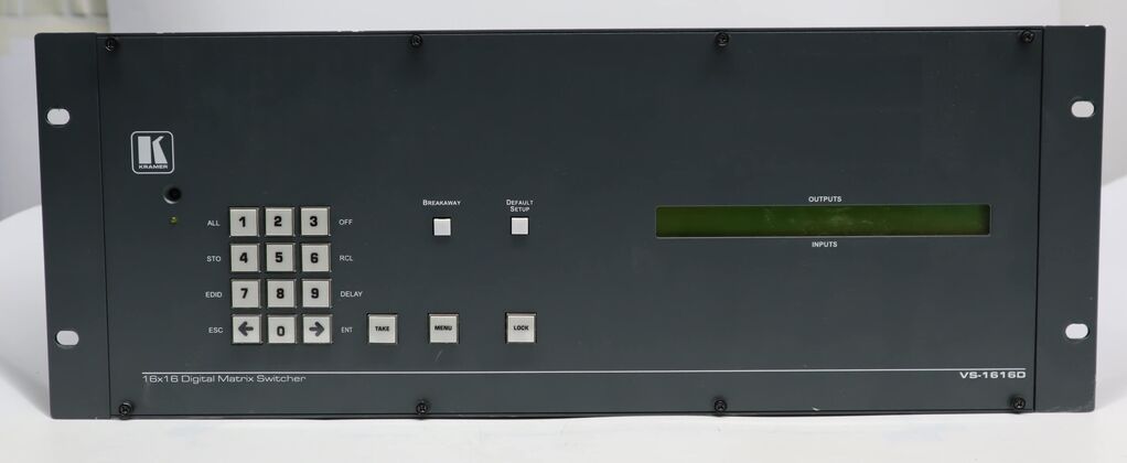 The VS−1616D is a high−performance matrix switcher chassis for AV signals. The unit is modular and populated from 2x2 to 16x16 in increments of two inputs and/or two outputs. The chassis includes a power supply, control module and a test module that can monitor and test any input and output in the matrix. VS−1616D supports a wide variety of input and output cards for different AV signals.