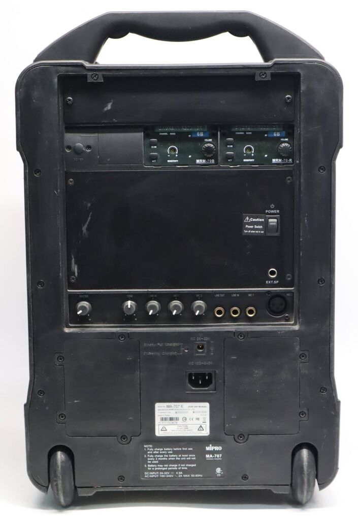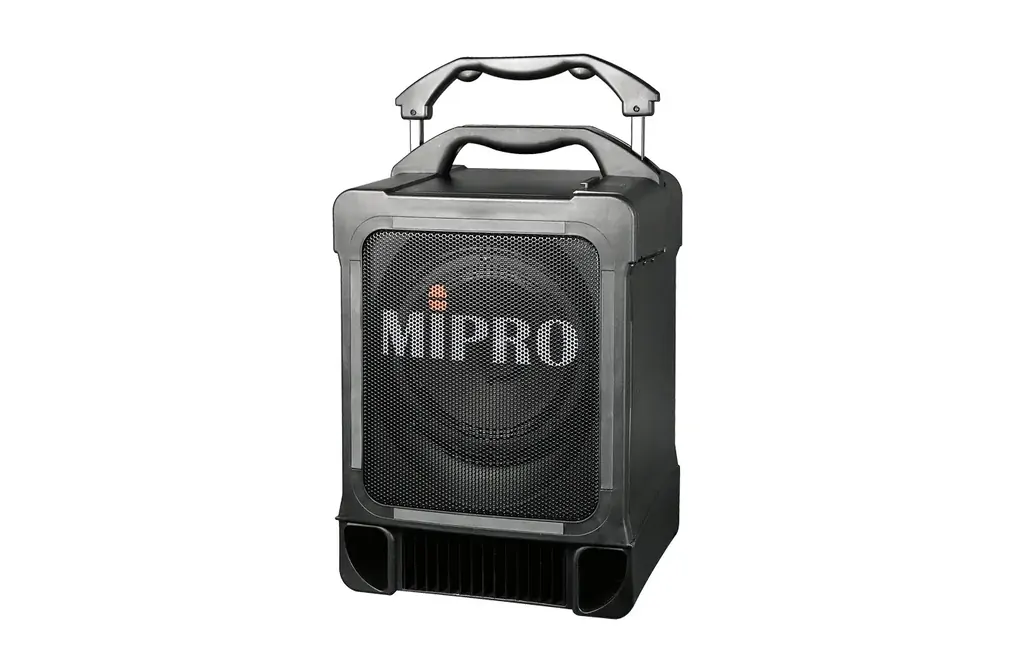 The MA-707 is a portable wireless PA system with a patented retractable handle and trolley wheels for easy transport. It provides strong output and versatile connectivity, including wireless microphones, Bluetooth, and external audio inputs.