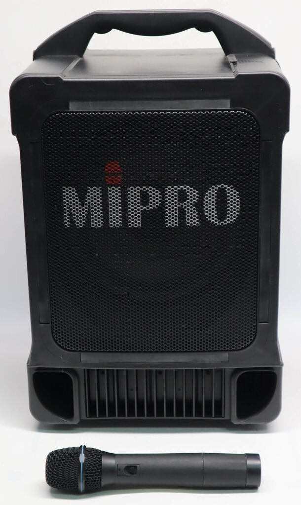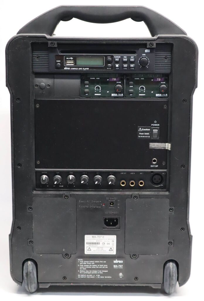 The MA-707 is a portable wireless PA system with a patented retractable handle and trolley wheels for easy transport. It provides strong output and versatile connectivity, including wireless microphones, Bluetooth, and external audio inputs.
