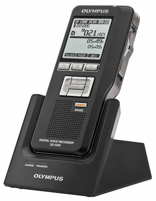 The Olympus DS-5000 multi-function cradle recharges the Ni-MH battery pack, allows hands-free recording, and provides for fast and easy uploading/downloading of data to your PC.