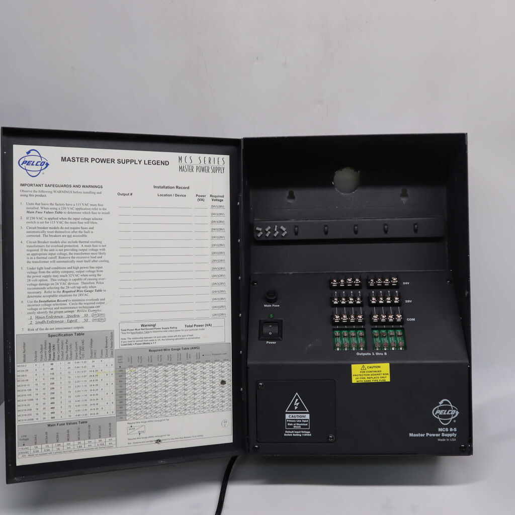 The MCS8-5 from Pelco is a reliable and efficient 5 Amp indoor power supply designed specifically for running up to 8 CCTV cameras, ensuring stable performance and safety. Equipped with self-resetting circuit breakers for each camera output, this power supply guarantees a secure operation while handling a wide voltage range.