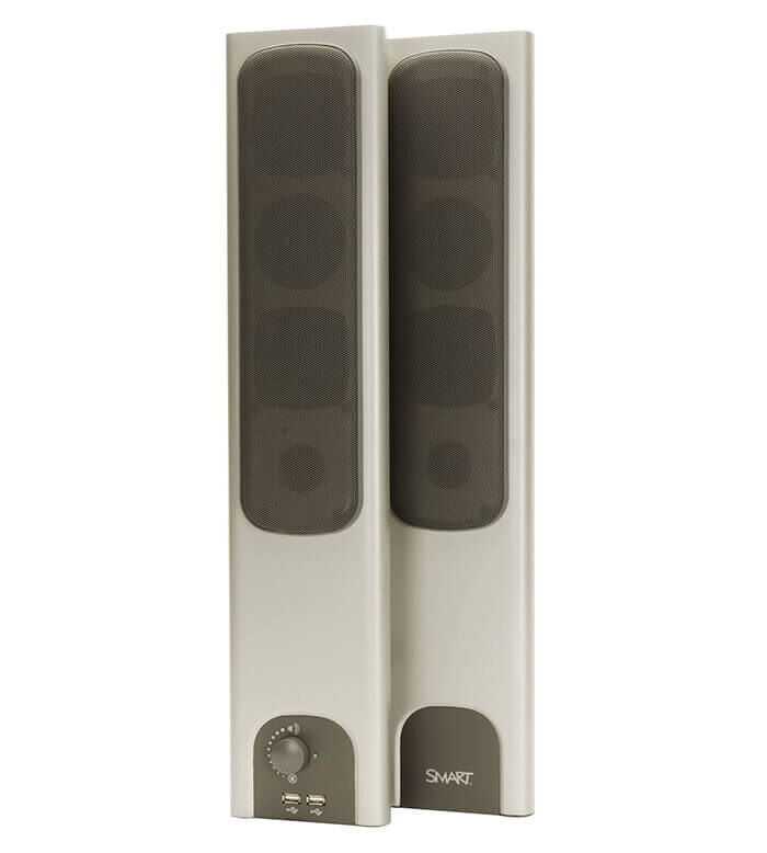 Add audio to your SMART Board interactive whiteboard with two 14-watt, stereo-amplified speakers that provide a consistent sound level in rooms up to 1,000 sq. ft. (93 m2). These speakers feature a volume control and integrated USB hub.