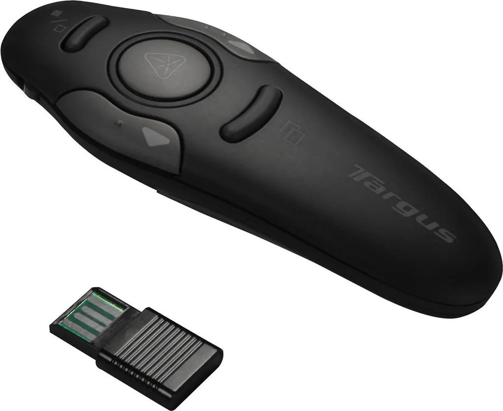 The Targus Wireless Presenter with Laser Pointer makes it easy to control your presentation from up to 15 metres away. The ergonomic design with soft touch surface makes it easy to hold the device in your hand and navigate through the buttons comfortably. The built-in laser pointer allows you to highlight key points while the other keys allow you to page up, page down, switch applications darken the screen and resume the presentation. The pre-set RF connection enables true plug-and-play capability; no driver is required.